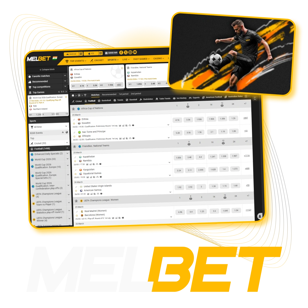 Indian bettors follow a wide range of football competitions. Melbet covers all of them with full market depth, from simple match winner bets to detailed player statistics.